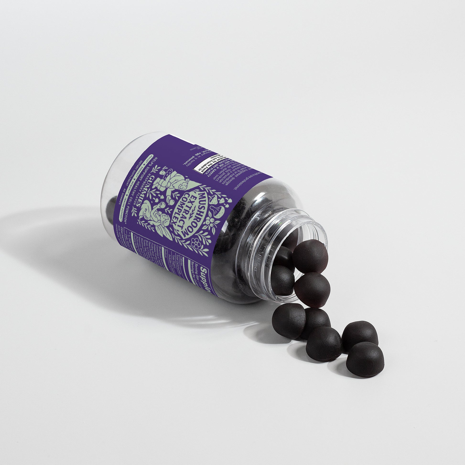 Mushroom extract (Maitake Fruiting Body 10:1 Extract, Shiitake Fruiting Body 10:1 Extract, Lion’s Mane Fruiting Body 10:1 Extract, Reishi Fruiting Body 10:1 Extract, Cordyceps Fruiting Body 10:1 Extract, Chaga Fruiting Body 10:1 Extract, Turkey Tail Fruiting Body 10:1 Extract, White Button Mushroom Fruiting Body 10:1 Extract, Black Fungus Fruiting Body 10:1 Extract, Royal Sun Mushroom Fruiting Body 10:1 Extract), glucose syrup, sugar, dextrose, pectin, citric acid, natural raspberry flavor, sodium citrate, purple carrot juice concentrate, palm oil (contains carnauba wax).
